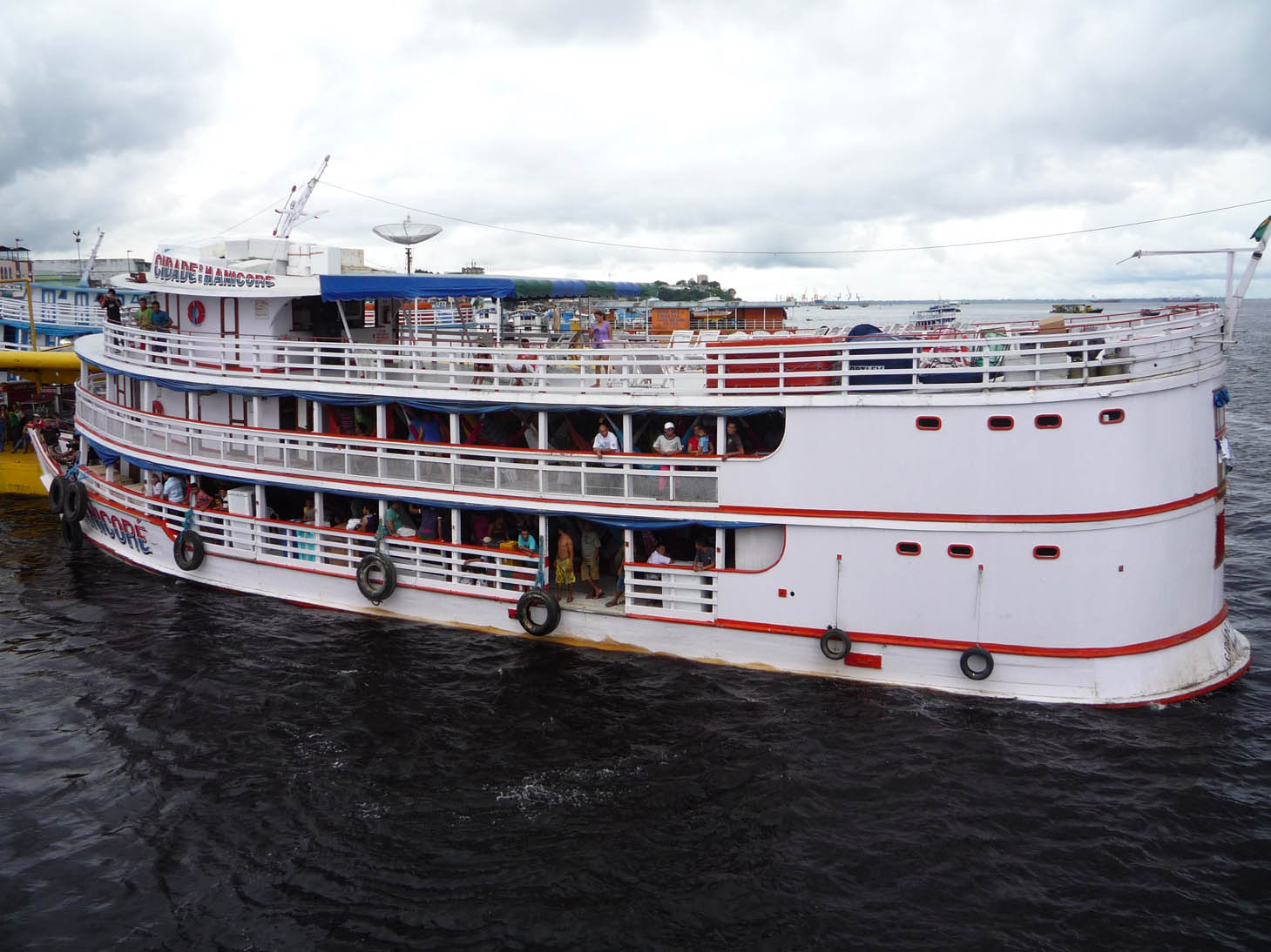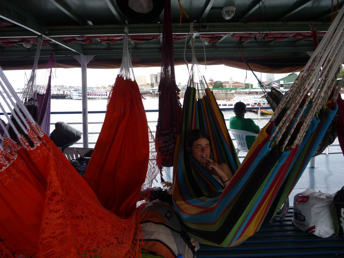 Arrivés à Manaus on aurait voulu y passer une nuit à l'hôtel mais les revendeurs de billet dans la rue nous persuade du contraire et nous achetons un billet pour l'après-midi même. On se retrouve donc dans notre hamac au milieu d'une cinquantaine de brésiliens. On passe le temps en lisant et faisant des mots-croisés. On a hâte d'arriver et on espère secrètement avancer très vite pour avoir un autre bateau à Santarem direction Macapa et arriver à temps pour la fête de Guillaume en Guyane.