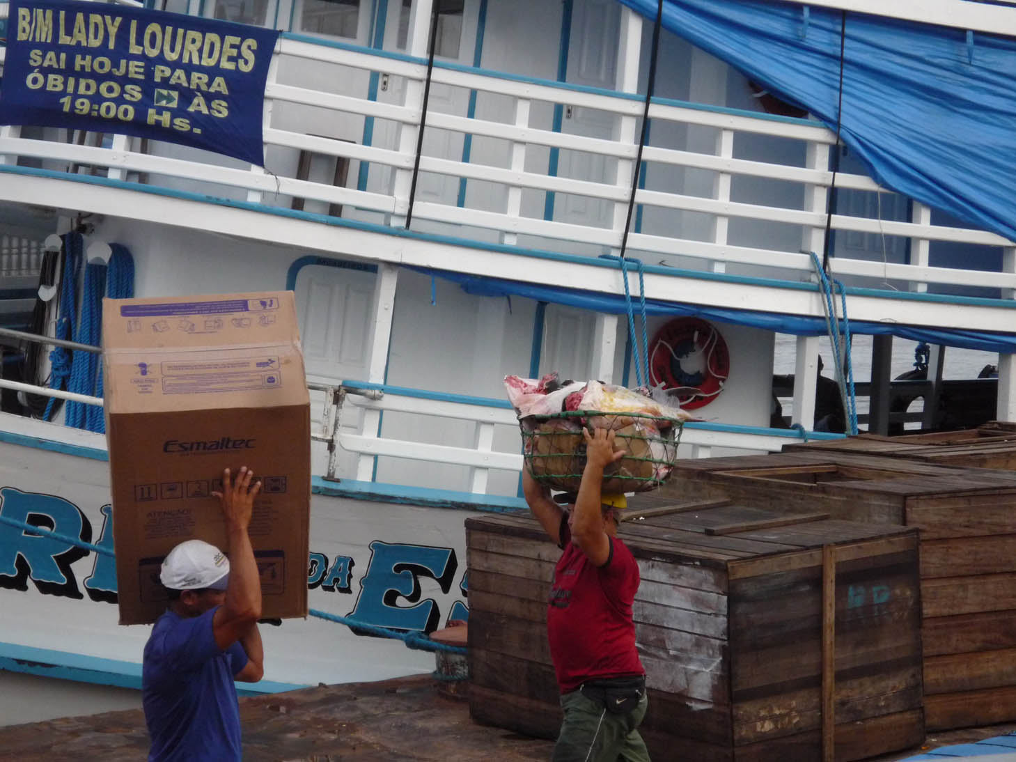 Malheureusement à Santarem le seul bateau pour Macapa ne partira que 2 jours après. On attend à quai, le capitaine du bateau nous autorise à squatter sur le bateau, on installe nos hamacs et on suit la vie des dockers, pas facile. Ils portent des charges impressionnantes pour charger et décharger les bateaux, on admire les pêches du jour avec des poissons tigres très très gros et on déambule dans la ville et on squatte aussi les cybers, mais le temps est long. On part enfin, notre bateau est tout petit et bien blindé et les gens autour de nous comme toujours très sympa. Il y a une petite bande de haïtiens avec nous et on fait connaissance de "copain" qui aime parler, parler ... Le lendemain on fait connaissance de Jacques un pote à lui mais beaucoup moins cool, il nous saoûle avec sa bible, un homme envoyé par dieu et l'église de dieu (une secte très active en Haïti) il a des paroles très grave en parlant de rebels et d'ennemis on lui fait part de nos critiques mais il est vraiment ensorcelé et on finit par essayer de l'éviter jusqu'à la fin du voyage, pas facile !