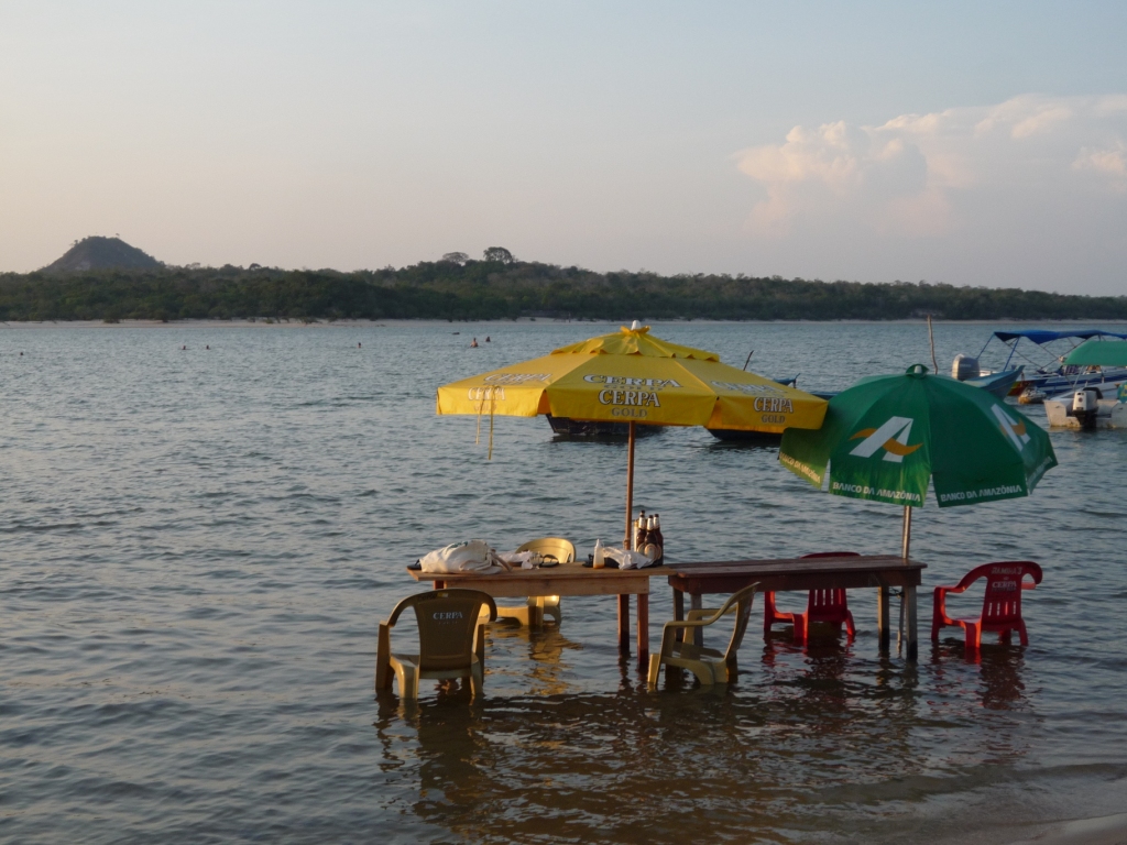Alter do Chào, 7000 habitants est située sur le rio Tapajòs un affluent de l'Amazone qui est disons plus limpide ... On doit voir à 80cm de la surface et il y a une grande plage de sable blanc ce qui fait de la ville une véritable station balnéaire au coeur de l'Amazonie. Après avoir pris deux places pour nos hamacs dans une 'albergue' tenus par des 'hippies', on s'est baqué, fais notre lessive et s'est fait une petite visite nocturne de la ville. Bizarre de voir du tourisme de locaux dans un pays à l'étranger :-) Il y a des bars avec des tables les pieds dans l'eau pour siroter une Cerpa (bière locale) et les adolescents paradent sur la sorte de promenade à côté de la plage.