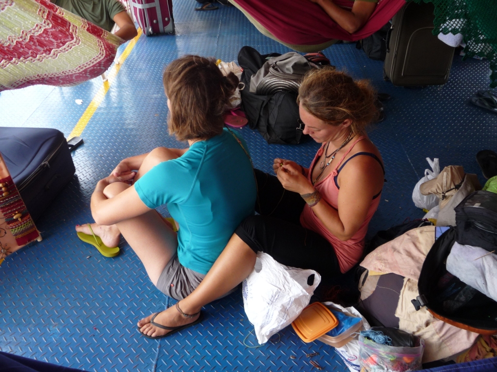Sur le bateau c'est un rythme de sage et aucune activité physique n'est possible, du coup c'est yam's, échec, lecture, sieste et jargeottage ... du matin au soir au matin ... La journée se déroule lentement. Le soir vers minuit alors qu'on dors tous, 57 jeunes hommes embarquent pour aller travailler 4 mois dans les mines d'aluminium ... Un autre joyeux bordel ... La journée suivante se déroule également lentement avec les mêmes activités, Roxane se fait faire une tresse ...