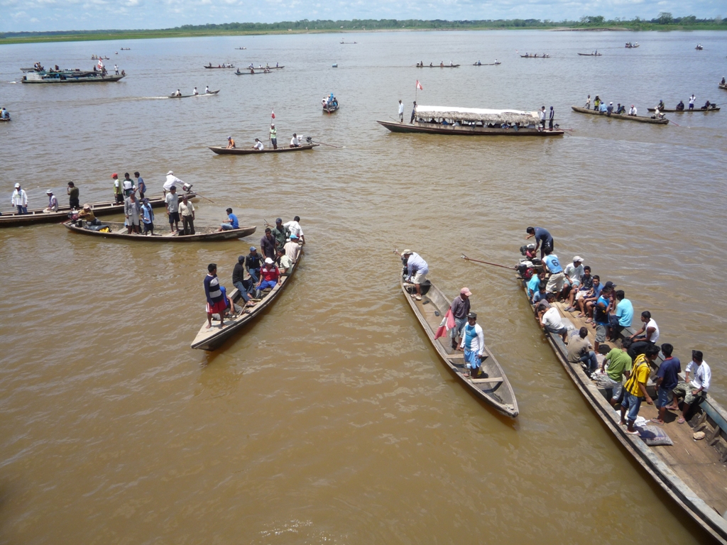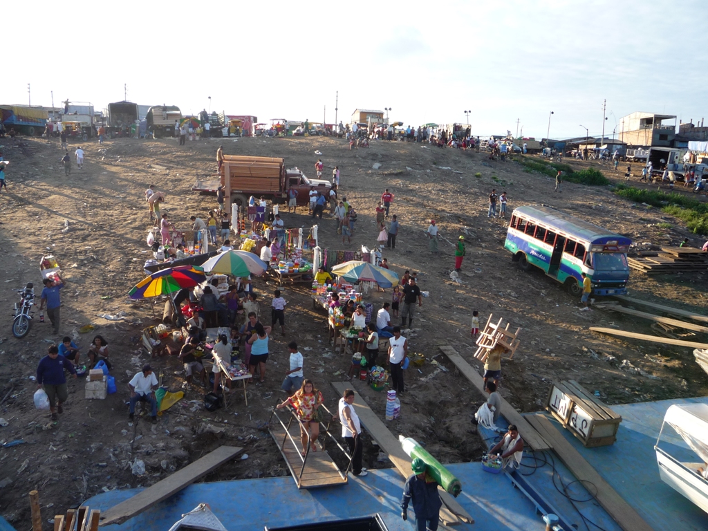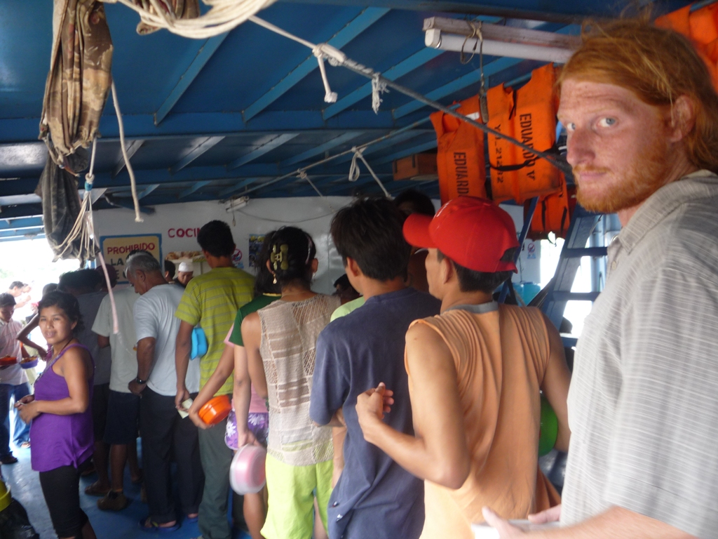 C'est le 1er bateau-hamac péruvien qu'on prend, le confort est moindre, il y a plus de monde, les sanitaires sont moins nombreux et moins propres. Il n'y a pas de réfectoire et il faut avoir sa propre gamelle pour chercher le repas à la cuisine, et plus important il n'y a pas de lieu de vie commun comme les bars sur les bateaux brésiliens ; mais c'est pas grave on est là que pour 48h ! Première nuit excellente, le bateau avance, on nous avait dit que les bateaux péruviens étaient lents et s'arrêtaient souvent pour businesser avec les communautés du fleuve, mais celui-là fait son bonhomme de chemin.