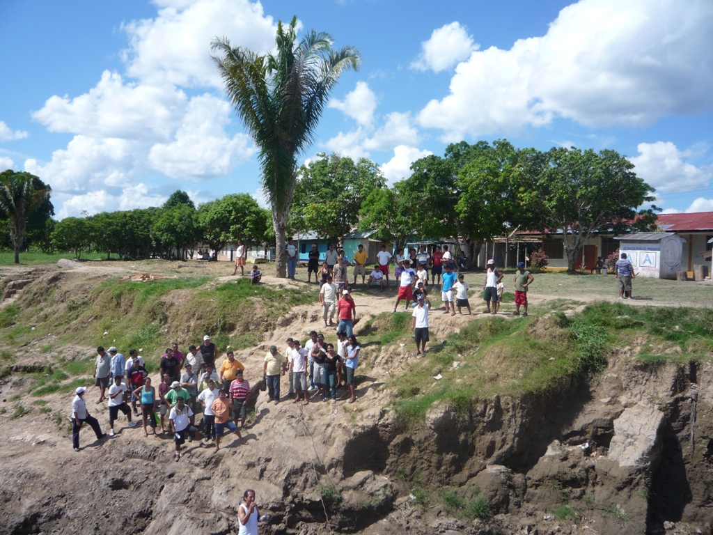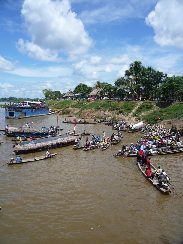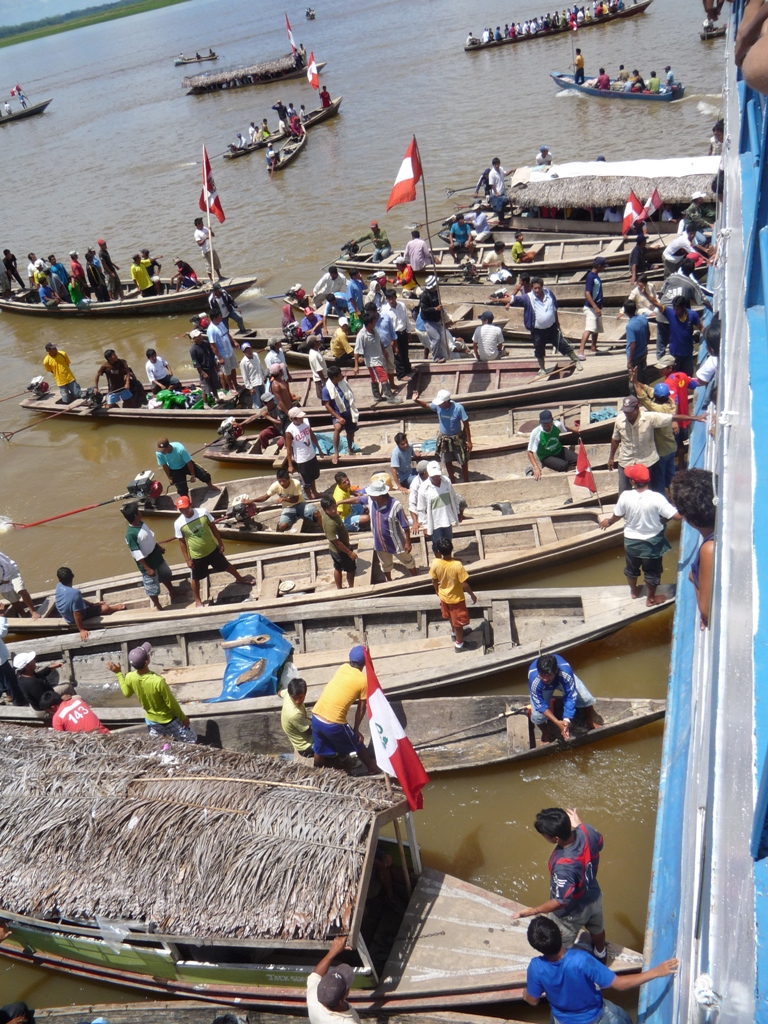 Mais tout à coup on comprend ce qu'on nous a dit la veille, il y a une manifestation sur le fleuve et pleins de petites embarcations viennent stopper le bateau et le sommer de se mettre à quai dans le village ... Tout le monde sur le bateau le prend avec le sourire, y compris le capitaine et il s'exécute. On cherche à comprendre les tenants et les aboutissants et on nous explique qu'il y a eu une pollution de l'eau suite à un accident d'un pétrolier (la région est pétrolifère) et que l'eau est devenue impropre à la consommation pendant un certain moment ... Normal d'être vénère quand même ! Ils ont du coup demandés des indemnités qui ne sont jamais arrivées ... Et du coup ils manifestent. Leur seule et unique façon de se faire entendre est par le biais de la manifestation pacifique sur des bateaux qui ne contiennent pas des marchandises trop vitales à l'approvisionnement du pays ... OK on est d'accord avec eux mais on sait pas combien de temps on va devoir rester là et on a rendez-vous avec notre guide à Lagunas et avec Jeff le 17 novembre ... On a le temps mais ça va être long ! On passe la journée à ne rien faire ...!! On fait un tour dans le village l'ambiance est sympa ... même un tournoi de foot de l'inter-syndicale. On va se coucher en nous disant que dans 3 jours va y avoir une réunion pour décider quand nous laisser partir ... Les gens sur le bateau commencent à discuter avec un peu plus de véhémence ... Pour nous c'est bonne nuit !