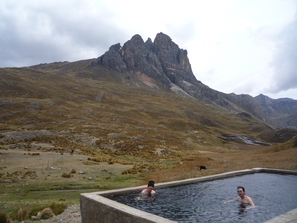 On retrouve le tracé du chemin traditionnel ; c'est presque trop facile :-), on apprend de nos erreurs et on longe la montagne plutôt que de foncer droit dans la plaine où c'est tout marécageux ... On rallie le camp dit de Huyahuash en moins d'une heure et il ne nous reste plus qu'une montée en pente douce jusqu'aux Portaciero de Huyahuash, un col situé à 4650m et une redescente jusqu'à une autre magnifique laguna (Viconga) et après, la récompense des guerriers ... les sources d'eau chaude à 4340m :-) Presque indescriptible le bien que ça fait après 5 jours de marche !