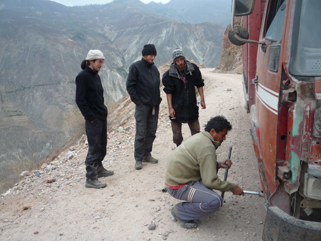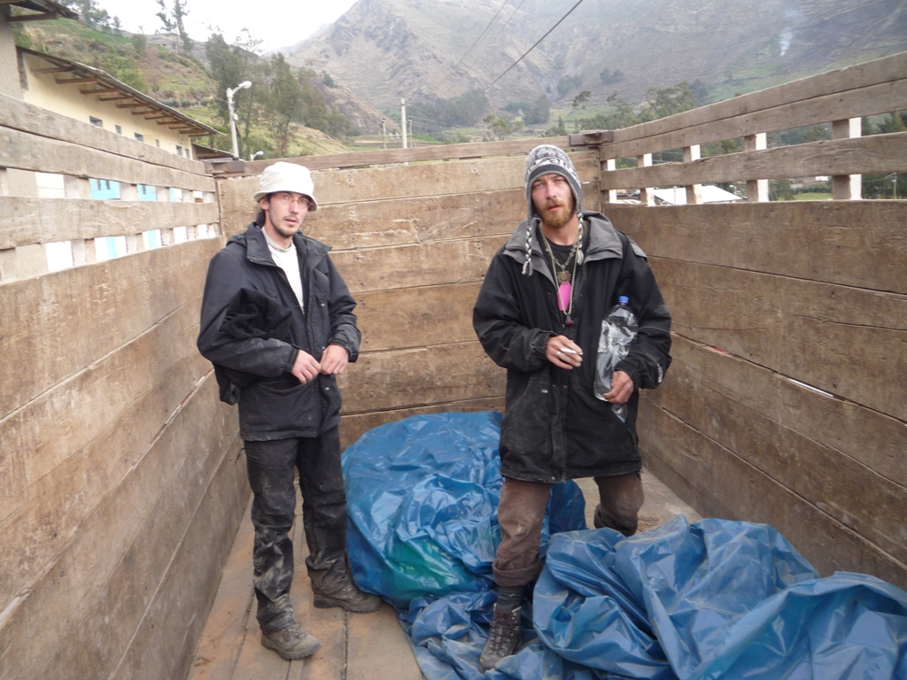 On profite du petit vestiaire (!) pour s'abriter et faire la bouffe parce que ça souffle pas mal dans la vallée ... Pour Jeff & moi on abandonne les nouilles chinoises ; rien que l'idée donne des hauts-le-coeur ... Petite partie de tarot dans la tente, dernière nuit (meilleure mais pas excellente) et en route pour le dernier jour de rando avant de revoir la civilisation ! Grosse journée quand même puisqu'il faut au moins faire 25km à plus de 4000 ... Mais bon la motiv est toujours là et on est content de nous ... du coup on enchaîne à bloc ... on voit même nos premiers lamas :-). On s'accorde un dernier midi plus long que les autres quitte à finir sous la pluie. Et juste avant la dernière montée on croise une route et on aperçoit un camion remontant et se dirigeant vers Cajatambo, 'notre' civilisation. On demande, ils sont d'accords ils nous prennent ... la classe notre premier camion péruvien ! Joli pour finir les +100 et -900m qu'ils nous restaient !