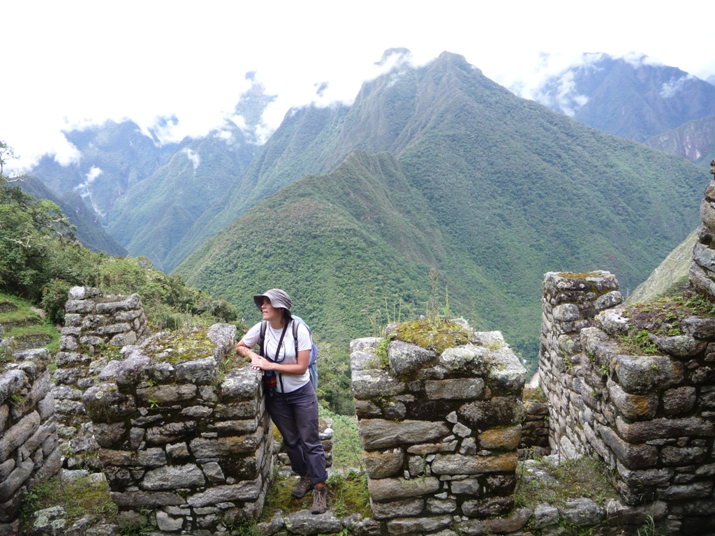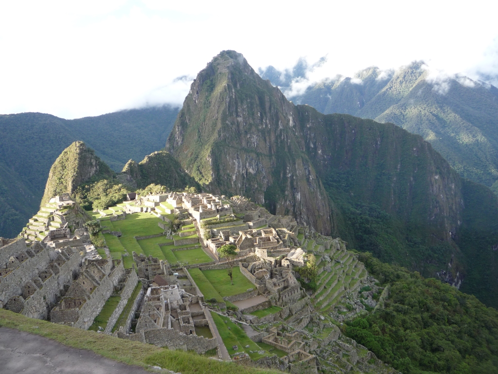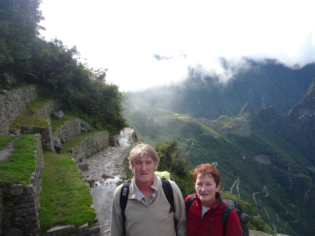 Du coup l'agence a dû raquer 51 dollars de plus par personne pour rattraper leur erreur et nous voilà 2h plus tard dans le train sur la route des Incas. Au Km 104 notre petite troupe descend et on commence la ballade (c'est loin d'être un trek mais c'est une ballade super bien). Notre premier vestige inca croisé sur la route est Chachabamba qui est un lieu d'étude d'astronomie et d'agronomie. On continue notre chemin tranquillement dans une végétation qui ressemble à celle de la Réunion car ici ça commence à être tropical ... On passe ensuite par Winaywayna qui est un site de terrasses agricoles et de logements pour stocker les légumes qu'ils déshydrataient mais aussi, comme toujours, un lieu de culte au soleil et à l'eau. On arrive ensuite dans une sorte de gîte ou une armée de cuistos nous attend pour nous régaler de leur plat chaud (c'est la classe de passer par une agence !). On monte ensuite sous une belle pluie les escaliers qui, dans le jargon des guides, s'appellent les gringos-killer steps !! Et on arrive au site Intipunku qui n'a rien de fabuleux en soit sauf que l'on y voit de haut ... le Machu Picchu ... et alors ... et bien c'est super beau ... et oui on comprend pourquoi c'est incontournable (et d'ailleurs Jeff il faut que tu reviennes) !!!
