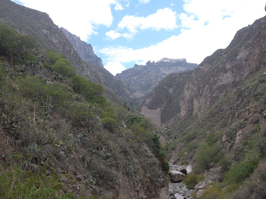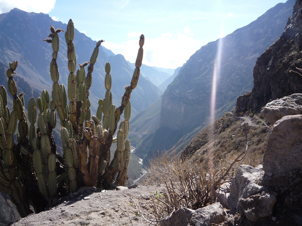 Mais bon finalement on arrive à Cabanaconde à 22h, on mange dans une minuscule chambre d'hôtel (original de se faire ramener la bouffe à 23h dans la chambre), on fait une petite nuit et on se dirige à 6h30 direction le 2ème plus profond canyon du monde ! Au programme du 1er jour : descente de 1200m direction San Juan puis remontée vers Cosnirhua, Matala et redescente dans la vallée au niveau de l'oasis de Sangalle. 5h de marche dans un paysage désertique mais dans lequel grâce à une savante irrigation pas mal de trucs poussent. Et en plus, à la clé, une petite baignade dans une piscine naturelle (et oui Julie ton rêve existe !). C'est pas mal du tout car normalement c'est très touristique mais là on était que 4 dans toute l'oasis :-)
