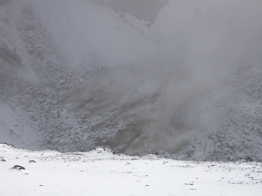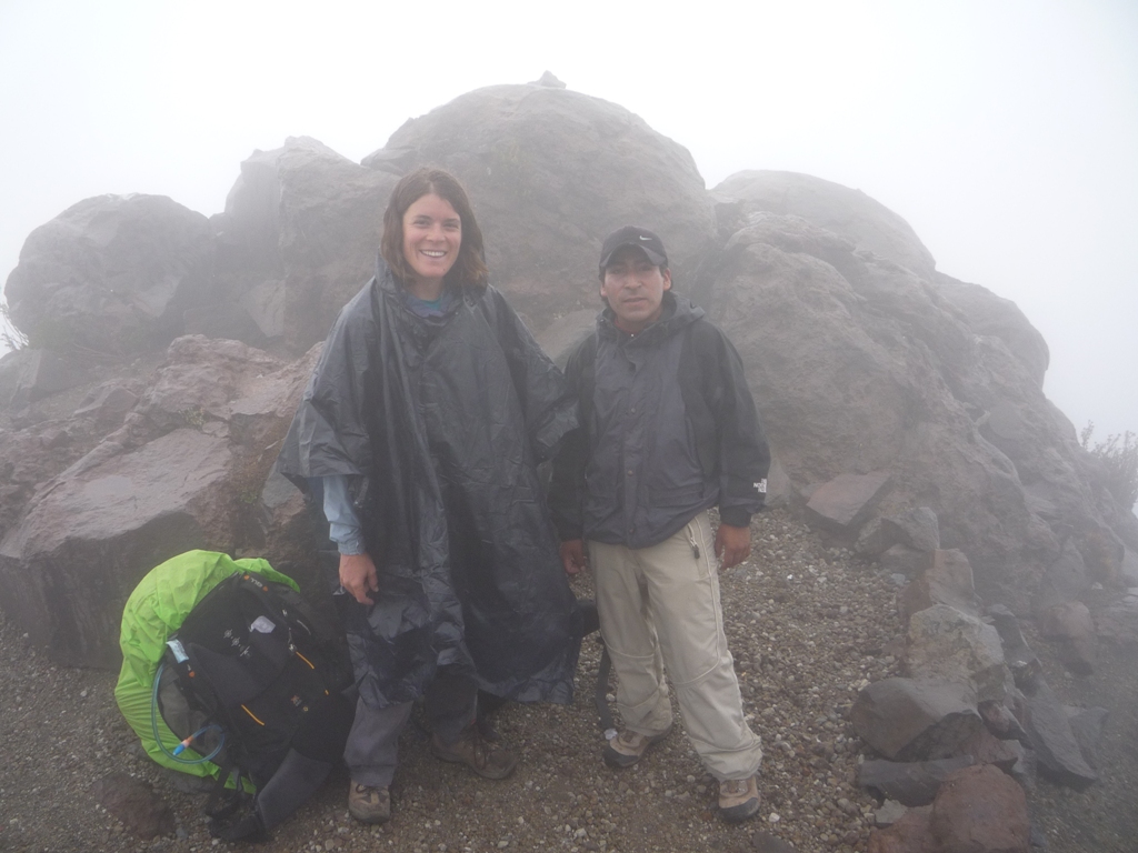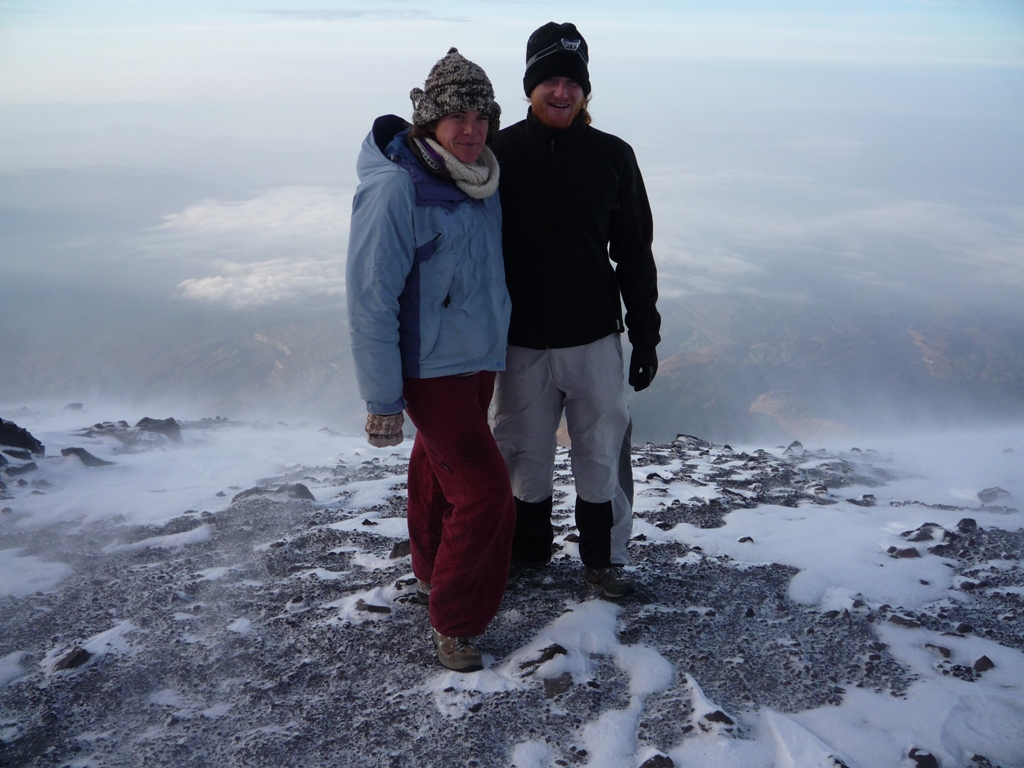 On marche, marche et marche et au bout de 4h30 on voit le sommet !! Et c'est là que je me suis sentie vide de chez vide, serais-ce psy ? Sûrement ! On était à 5700m avec du vent et du froid, mais, la volonté est arrivée (sans se presser) et c'est reparti. 30 minutes après on était en haut et ça fait chaud au coeur. On s'est congratulé avec Seb, on a profité du paysage et on a remercié Lucio notre petit guide (il fait 1m54, c'est lui qui me l'a dit !). On est ensuite redescendu puis remonté, c'était horrible de remonter après le sommet mais bon c'était pour voir le cratère avec ses fumerroles (j'ai alors compris que l'odeur de pet n'était pas dû à une éventuelle gastro de Lucio !).