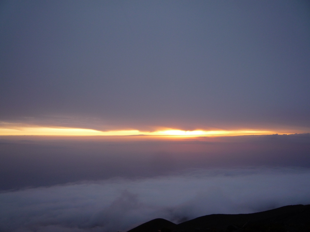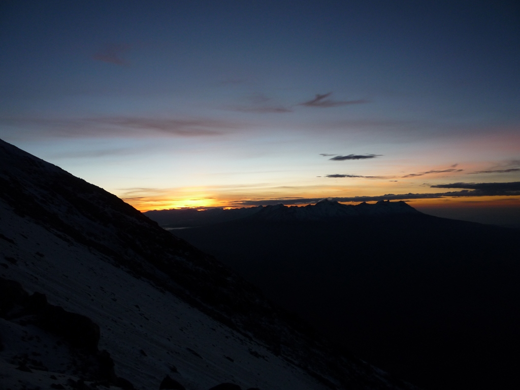 C'est difficile de se lever dans le froid et en plus j'ai pas beaucoup dormi à cause de l'altitude : c'est insomniant. On part dans la nuit lampe frontale sur le front (on a pas trouvé mieux pour une lampe frontale, si, si, si). Le début est facile car moi je n'ai pas de sac et Seb un petit, on a laissé le reste au camp. On monte dur c'est bien raide. On observe tout d'abord les lumières d'Arequipa, ville impressionnante puis vient le lever du soleil avec des couleurs fabuleuses : jaunes, bleues et vertes. On peut ensuite admirer les différents canyon qui entourent la ville, et oui on est déja haut, environ 5300m et nous allons toujours bien.