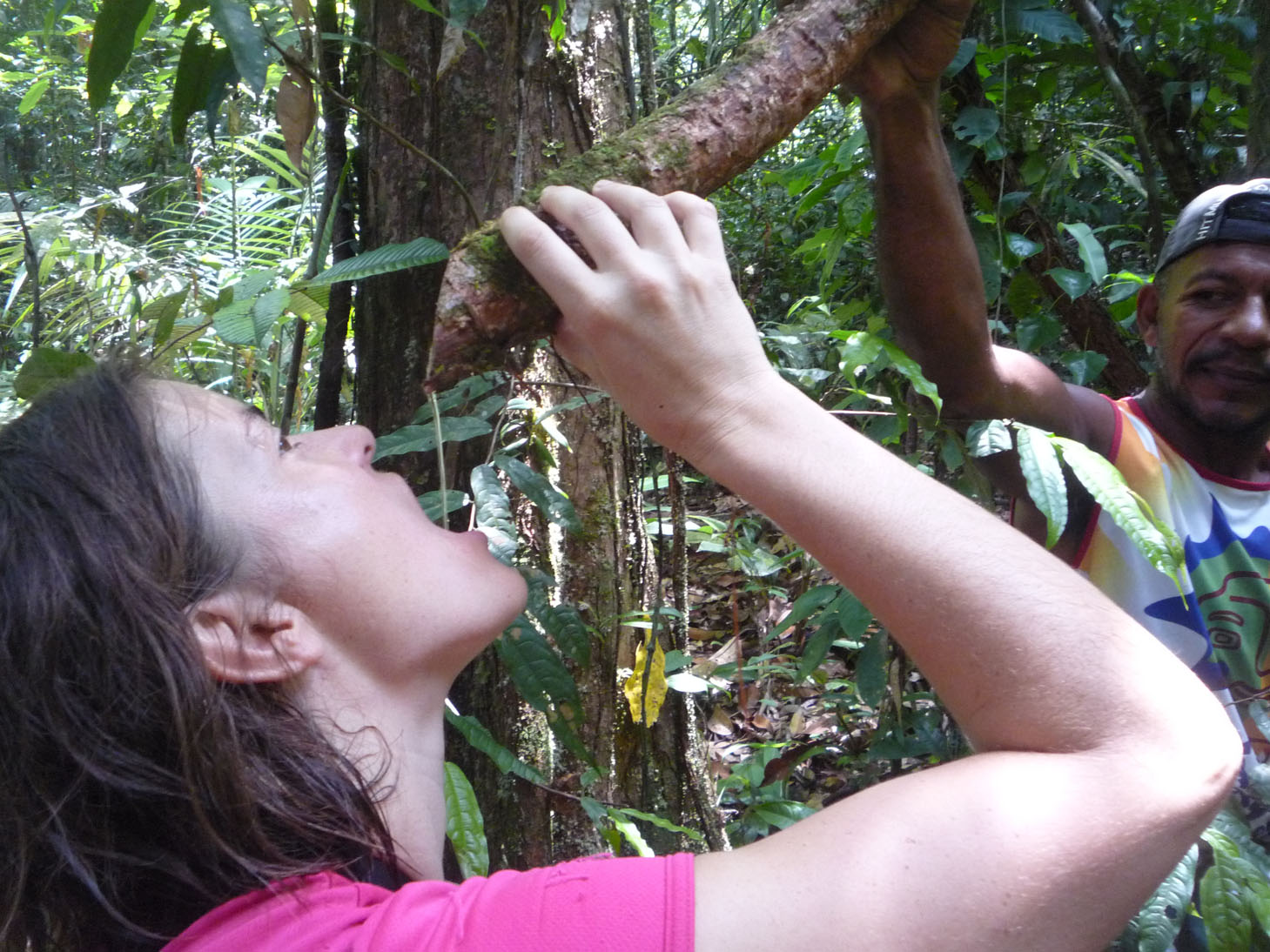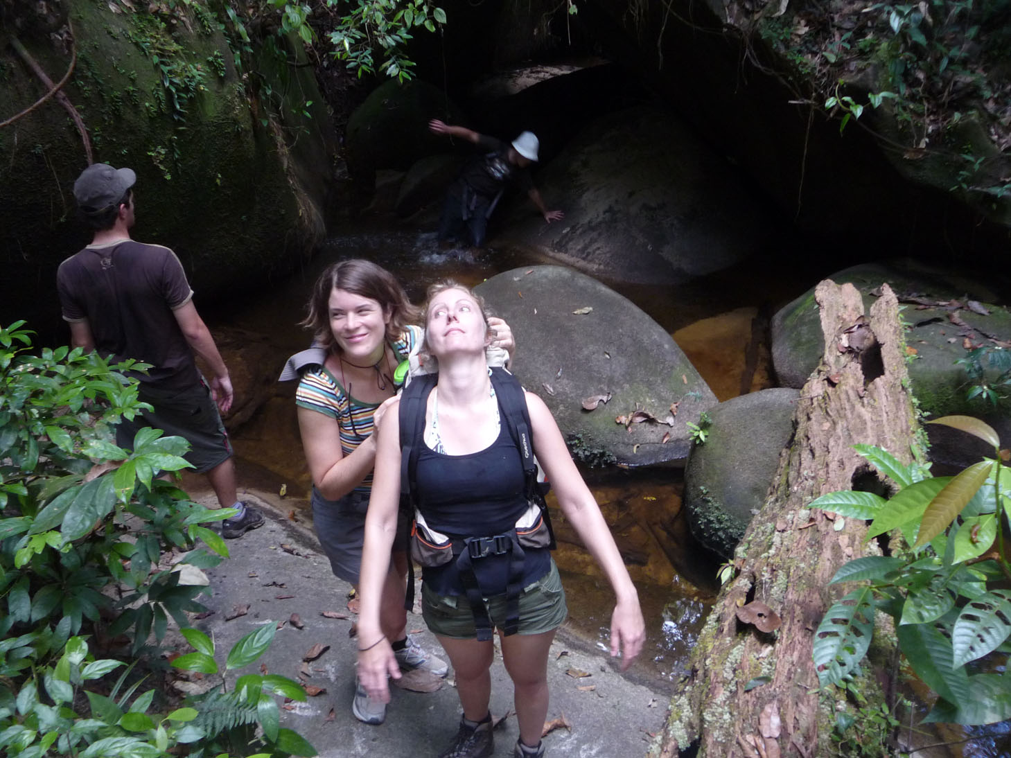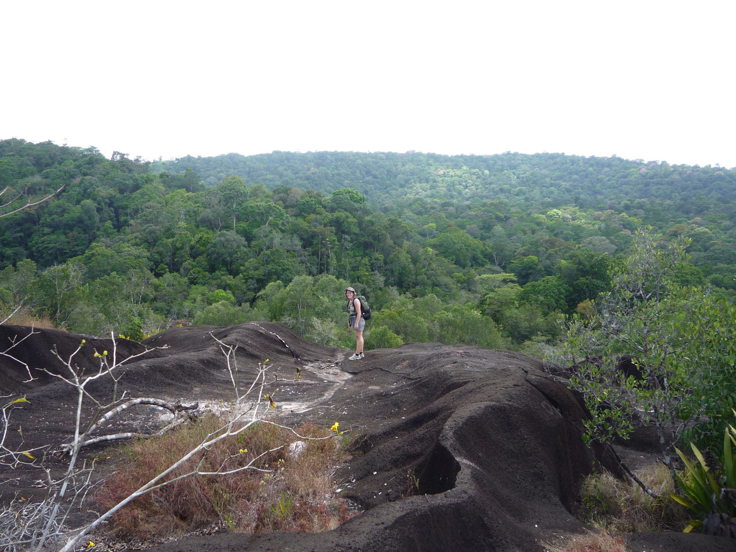 Rejoins en route par Sam, Amélie et Paul on a décollé vers 9h pour une petite heure de pirogue où l'on a franchit notre premier saut :-) et après avoir dépassé les camps d'entraînement de la légion étrangère on se retrouve au début d'un layon (un chemin en jungle) présenté comme une autoroute :-). Raphaël notre piroguier nous montre les rudiments de la débrouille en jungle, le bois vache qui lorsqu'on l'entaille fait couler une sève blanche, comestible, un peu calorique et les lianes, qui, si on les coupe peuvent donner de l'eau. Toutes les lianes ne sont pas forcément comestibles, attention, il est difficile de les reconnaître. Pour récupérer l'eau il faut couper d'abord le haut de la plante puis le bas car sinon l'eau a tendance à remonter et la partie coupée s'assèche instantanément. Après 2h30 de marche (1h15 annoncée ... :-) on arrive à Savane Roche Virginie qui est un inselberg, une montagne île littéralement en allemand. C'est une formation rocheuse qui surplombe la jungle d'où l'on voit toute la canopée (le mètre supérieur de la jungle qui concentre le plus de vie car il y a le plus de lumière). De l'inselberg c'est la jungle à perte de vue.