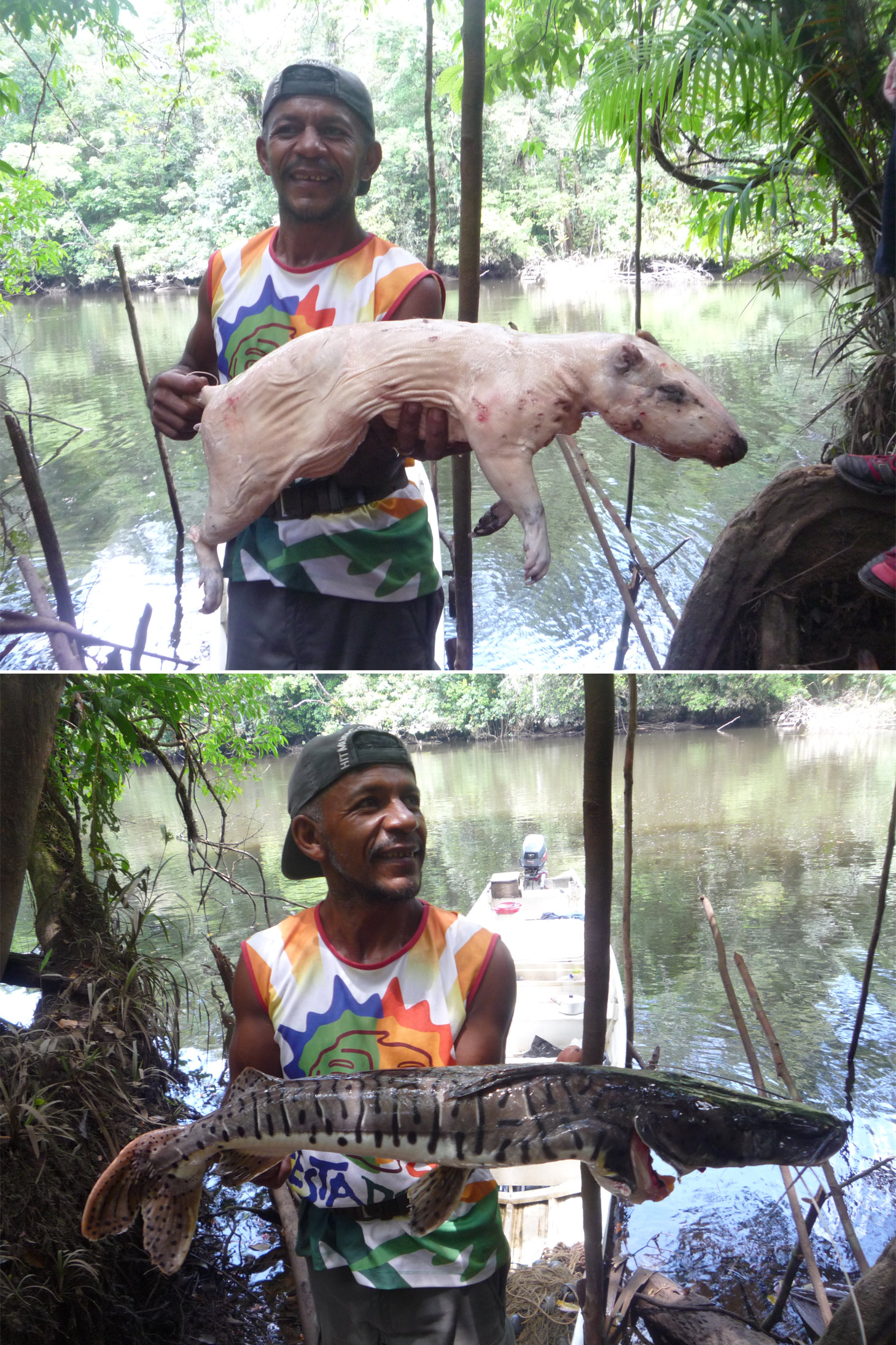 On a fait ensuite la marche retour avec une petite baignade à la crique pour se rafraîchir et re-départ en pirogue où l'on a guetté l'anaconda sur les berges sans toutefois le trouver :-( Raphaël nous a montré le fruit de sa chasse et de sa pêche nocturne, un pak attrapé au fusil, un énorme rongeur et un poisson tigre au filet de pêche, un poisson qui retourne la vase.