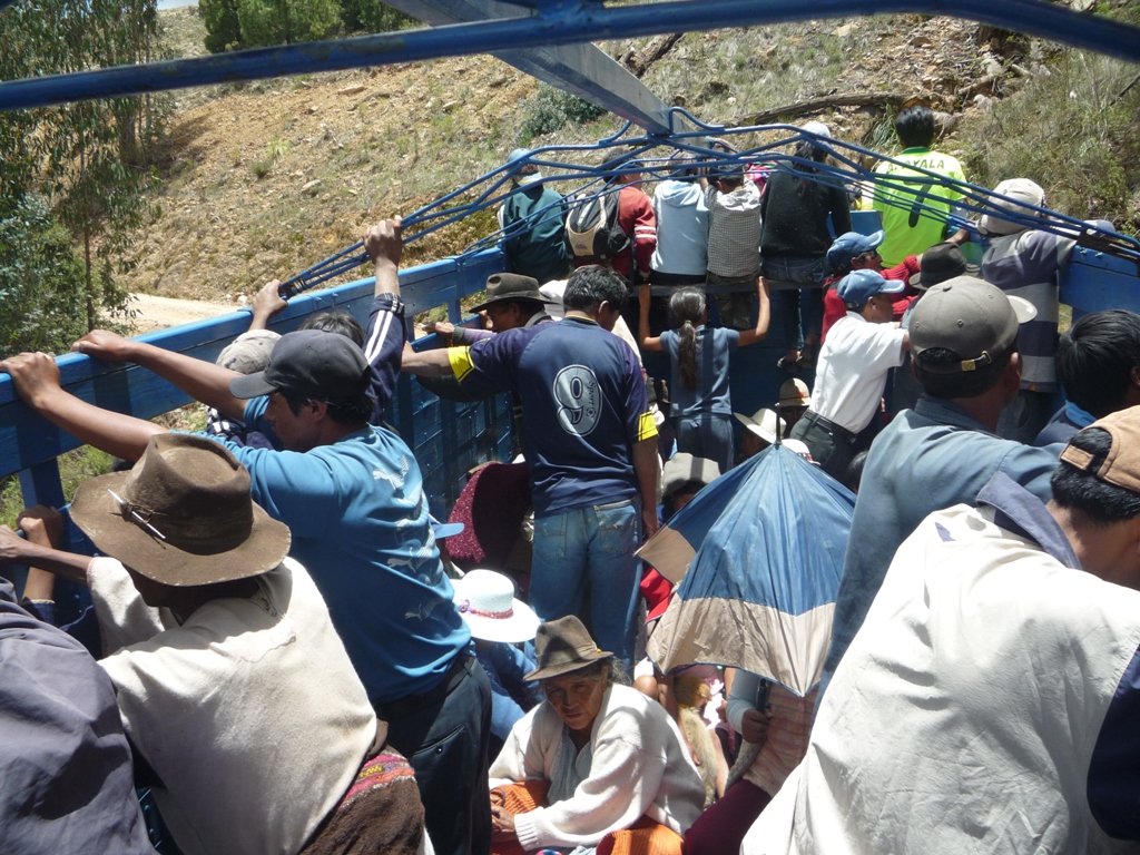 Départ samedi matin. On sait qu'il y a un bus par jour le matin ... On se rend à l'endroit qu'on nous a indiqué et on trouve un bus qui part à 10h. Malheureusement il est 7h30, pas trop envie d'attendre si longtemps du coup on trouve un camion qui part dans la même direction. Il partira lui aussi à 10h :-). On attend donc 2h30 sous le cagnard. Le camion se remplit, se remplit, ... On décolle et finalement on s'arrête à 11h pour le repas :-) On redécolle à 12h pour finalement arriver au point de départ de notre rando à 13h10. Levés à 6h50 pour 2h10 de route et arriver à 13h10. C'est pas grave le camion c'était original, plein de bourrés à l'alcool à 96 degré, la route était belle et ça nous a permis de rencontrer Casimira une gentille vieille dame qui habite à côté du bled où on veut dormir. Ca sera donc notre guide pour la rando de 4h qui suit. Elle a la forme et la tête sur les épaules puisqu'elle nous proposera son artisanat !